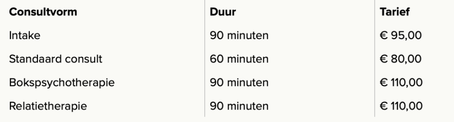 De tarieven zijn bewust laagdrempelig gehouden en liggen momenteel aan de onderkant van de marktconforme tarieven binnen de GGZ, passend bij de startfase van de praktijk. De tarieven op deze website zijn met zorg opgesteld, maar kunnen indien nodig worden aangepast.